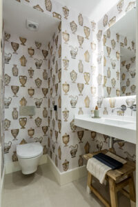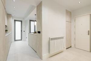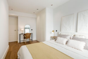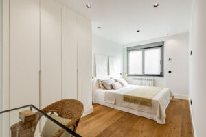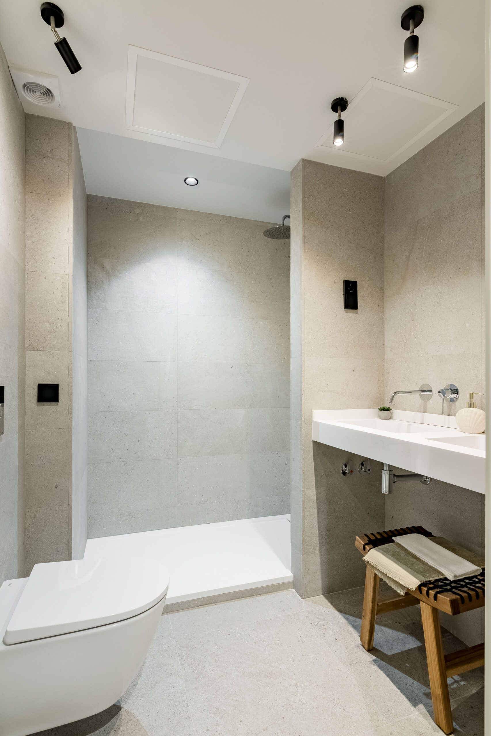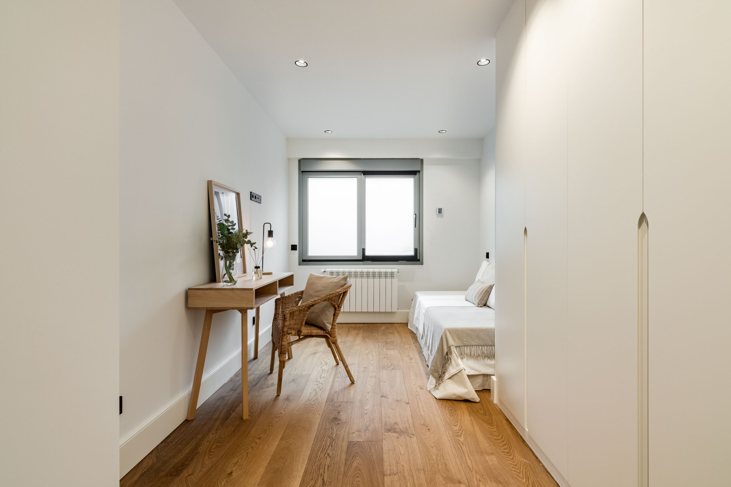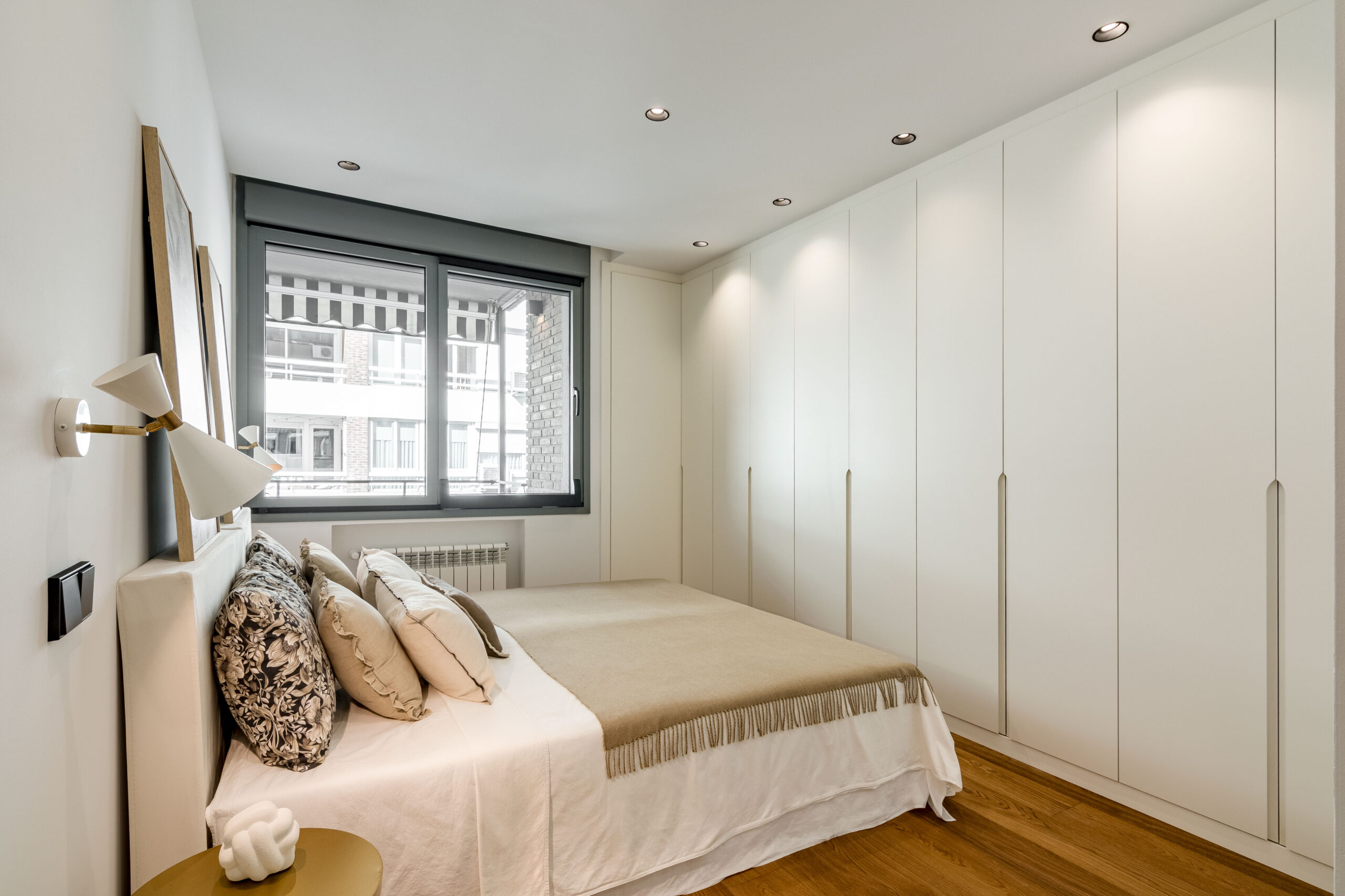 Suelos de tarima de madera natural y alicatados Porcelanosa de gran formato en baños y cocina. Armarios empotrados lacados, forrados en su interior de lino, con baldas, cajones y barras para colgar.