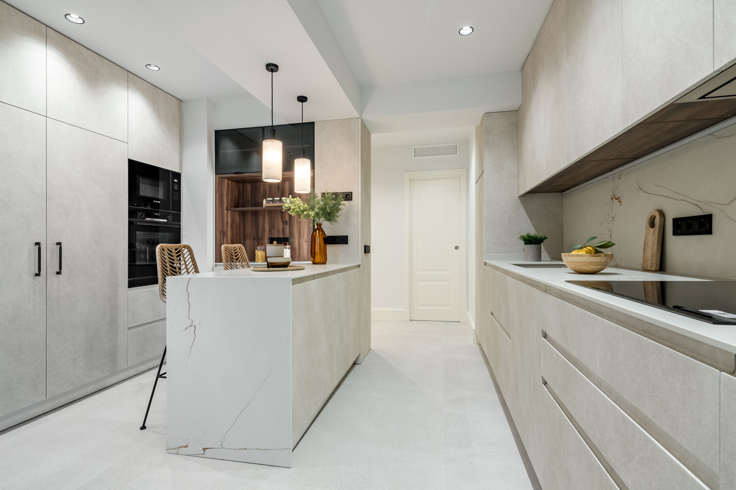 Cocina de Chef: Independiente y pensada para el día a día. Está completamente equipada con frigorífico Side by Side, torre de horno y microondas, lavavajillas integrado, vitrocerámica, lavadora y secadora, todo ello con la garantía que ofrece la marca Bosch. Tiene una capacidad de almacenaje sobresaliente (muebles altos, bajos y cajoneras). Además, cuenta con acceso a una práctica terraza-tendedero.