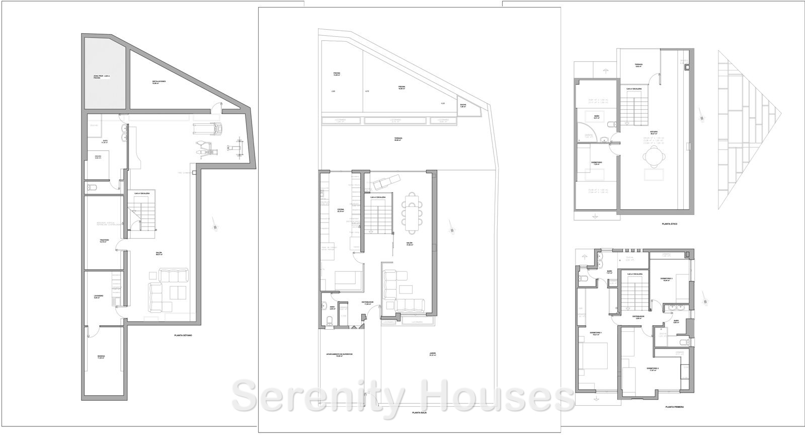 - Planta Superior: Estudio con baño, jacuzzi y terraza.