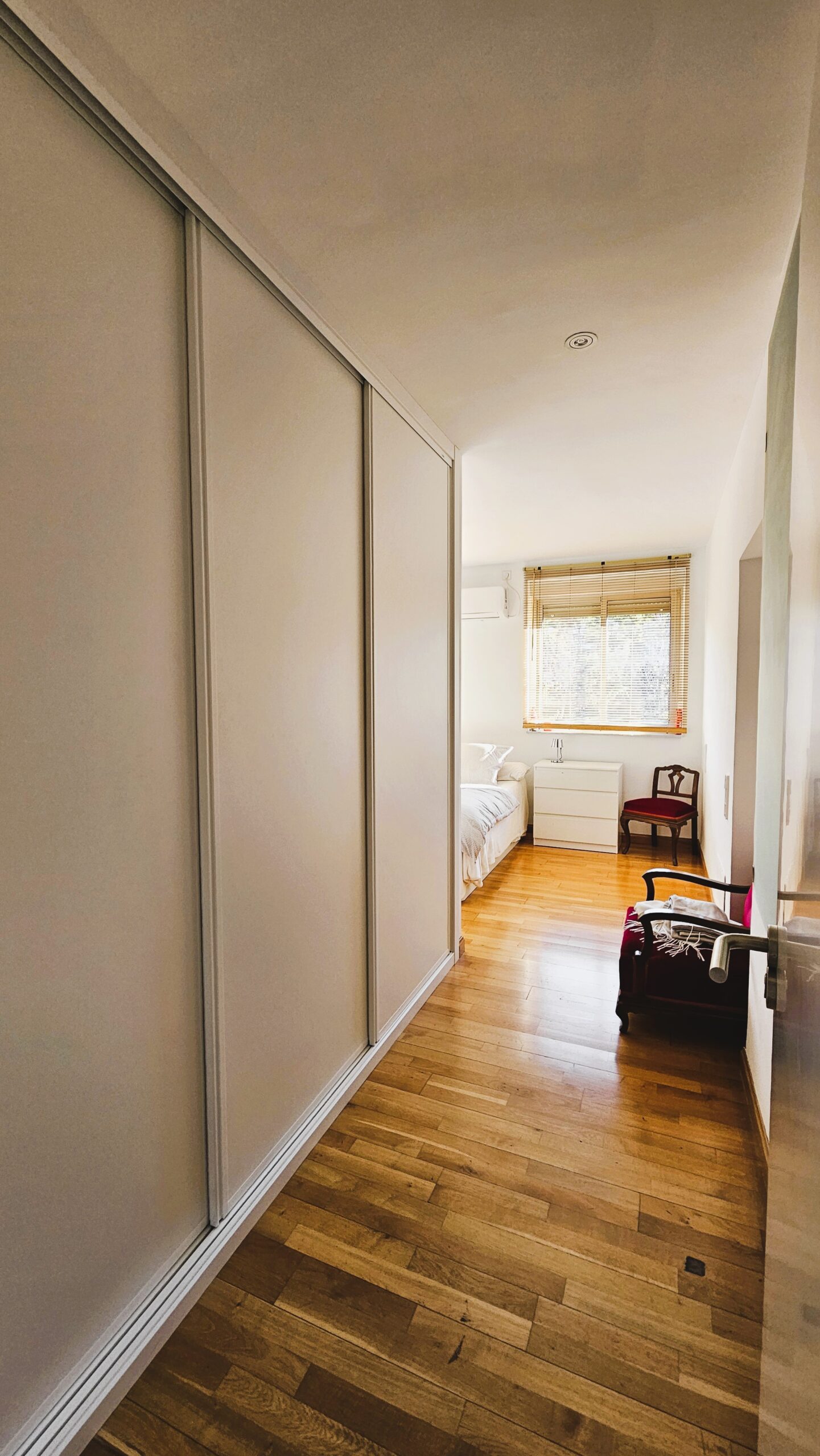Desde el salón, un distribuidor (2,5 m²) con armario empotrado conduce a las dos suites: