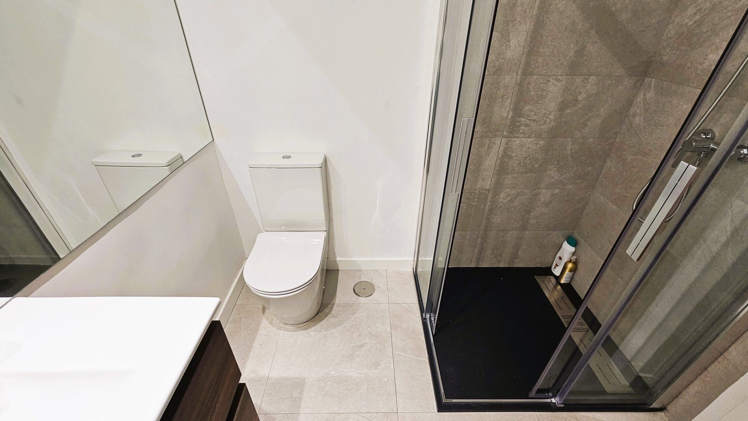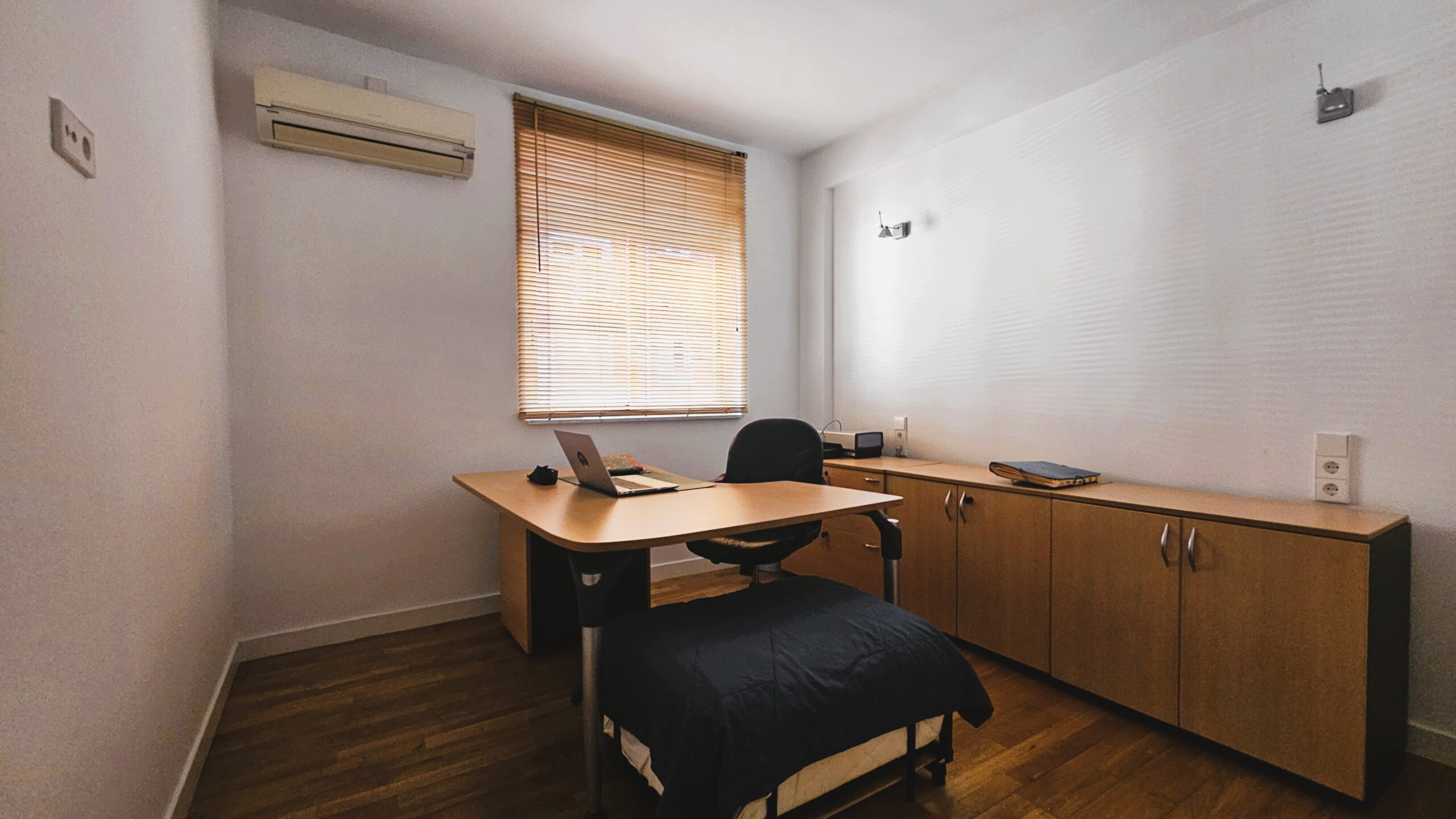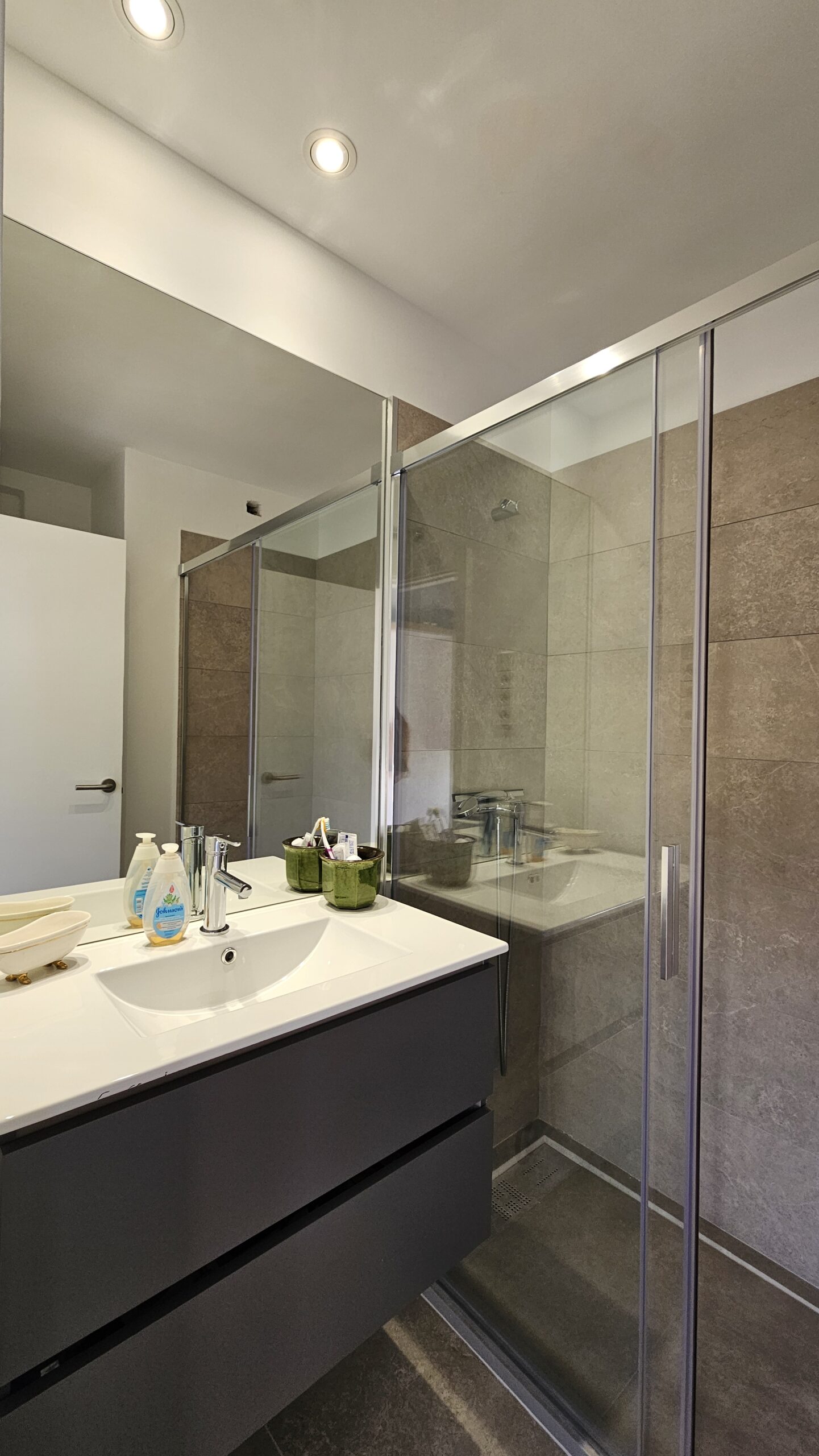 - Suite Secundaria (10,5 m²): Actualmente dispuesta como elegante despacho, cuenta con un amplio armario empotrado (aprox. 2 m) y un baño privado (4,5 m²) revestido en porcelánicos de tonos grises y blancos, con una gran ducha y lavabo con almacenaje.