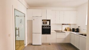 - Cocina de Vanguardia (10 m²): A la izquierda, una cocina totalmente nueva y moderna, diseñada con una sofisticada combinación de tonos grises y blancos y encimera de veta gris. Incluye una puerta traslúcida que permite el paso de la luz natural desde el norte y un práctico espacio auxiliar, perfecto como zona de lavandería discreta o armario de apoyo.